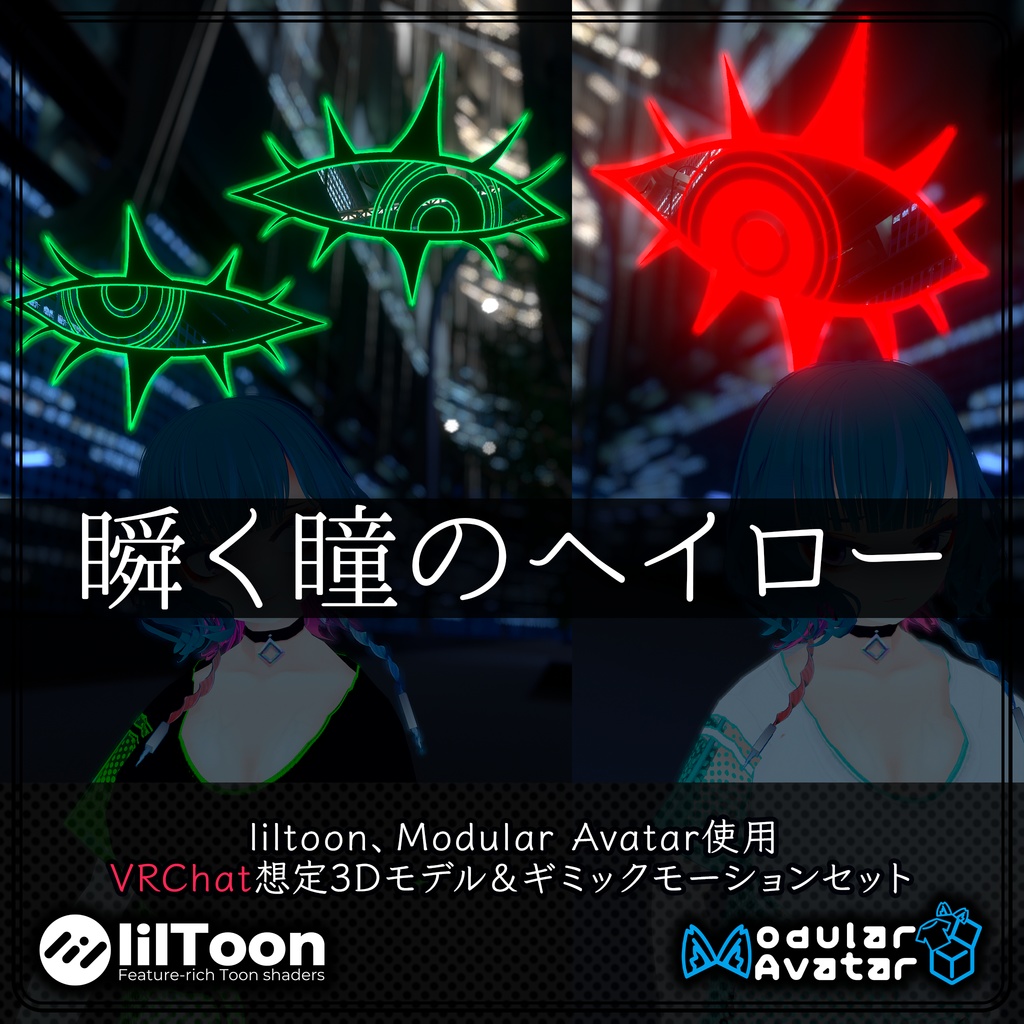 VRChatでの利用を想定したセットアップ済み3Dモデルです。 Modular Avatarによってお持ちのアバターに取り付けて遊べます。 VRChatのEXメニューでの操作から、視線のコントロールや瞬きの調整が可能です。 俊敏な表示/非表示演出もあります。 Quest版での動作は未検証です。liltoonの機能が必須の表現を含むため、対応は困難です。